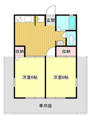 | 間取り詳細 | 洋室6帖、洋室6帖、DK、バス、トイレ、専用庭 | ||