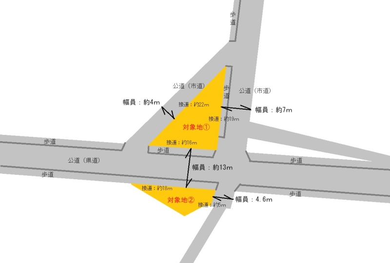 | 接面道路 | @南約13m幅(接道幅約19m)、東約7m幅(接道幅約19m)、西約4m幅(接道幅約22m)A北約13m幅(接道幅約18m)、東約4.6m幅(接道幅約5m) |