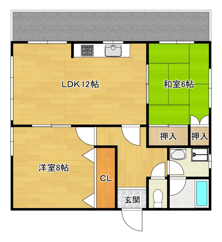 - LDK12帖、和室6帖、洋室8帖、バス、トイレ