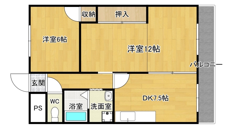 DK7.5帖、洋室12帖、洋室6帖、バス、トイレ