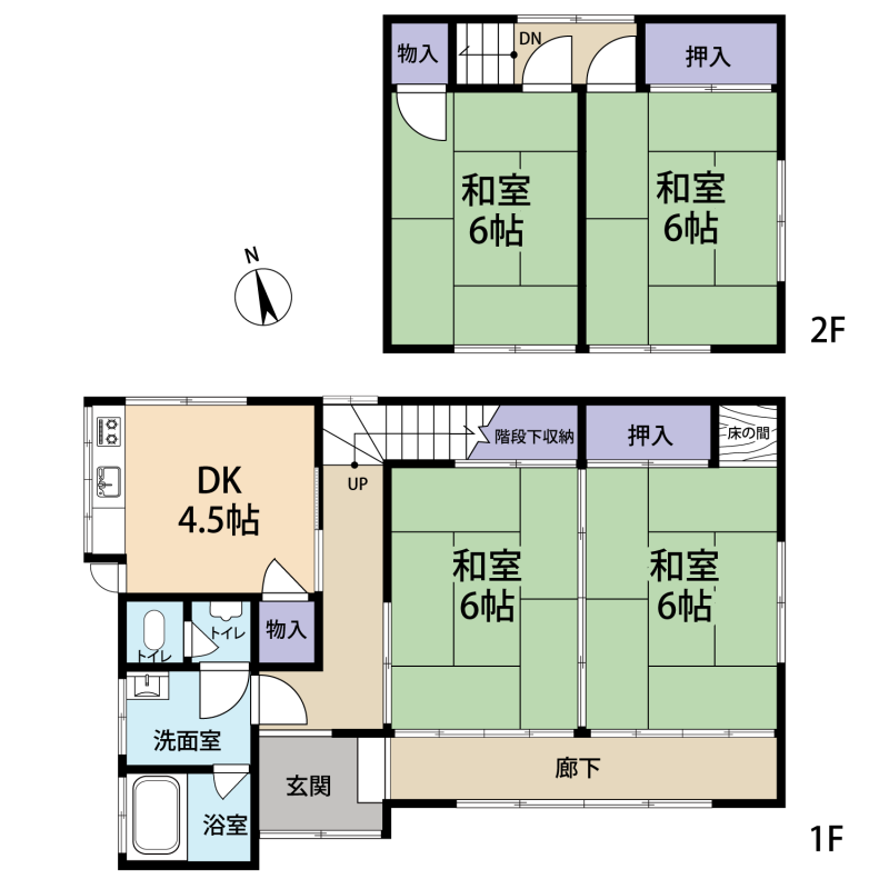- 1階 DK4.5帖、和室6畳、和室6畳、物入、洗面、浴室、トイレ