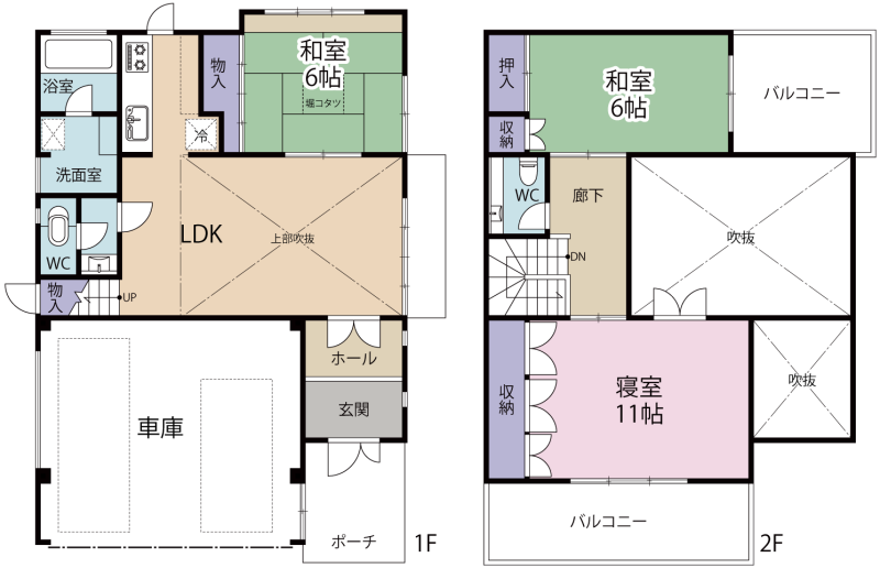 - 1F LDK(上部吹き抜け)、和6帖、トイレ、洗面、浴室