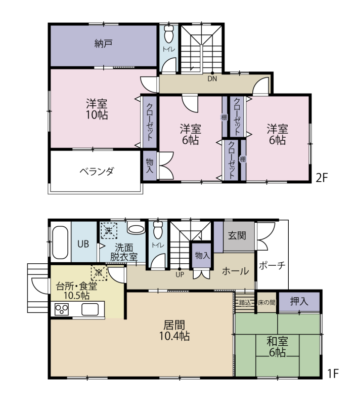2F 洋室6帖、洋室6帖、寝室10帖、納戸、トイレ