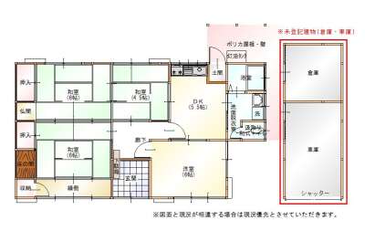 | 間取り詳細 | DK約6帖、洋6帖、和4.5帖、和6帖(押入・仏間)、和6帖(押入・床の間)、縁側(収納)、汲取和式トイレ、洗面脱衣室(洗濯機置場)、浴室、ポリカ屋根壁付き物干等スペース、※未登記建物:倉庫・車庫(シャッター付) |