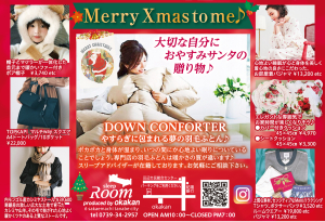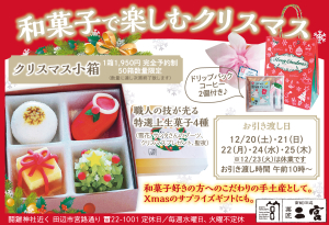 福菱年々ファンが増えている、パティシエ手作りのXmasケーキ。一番人気は、ふわっふわで甘さ控えめの「生クリーム」。ほかにも看板銘菓・かげろうを使った「ラッピングかげろう」、Xmasモチーフのミニケーキ6種セットの「スノーギフト」、マロンとチョコムースの「モンブラン」などラインアップは華やか。一部は数量限定、予約はお早めに!