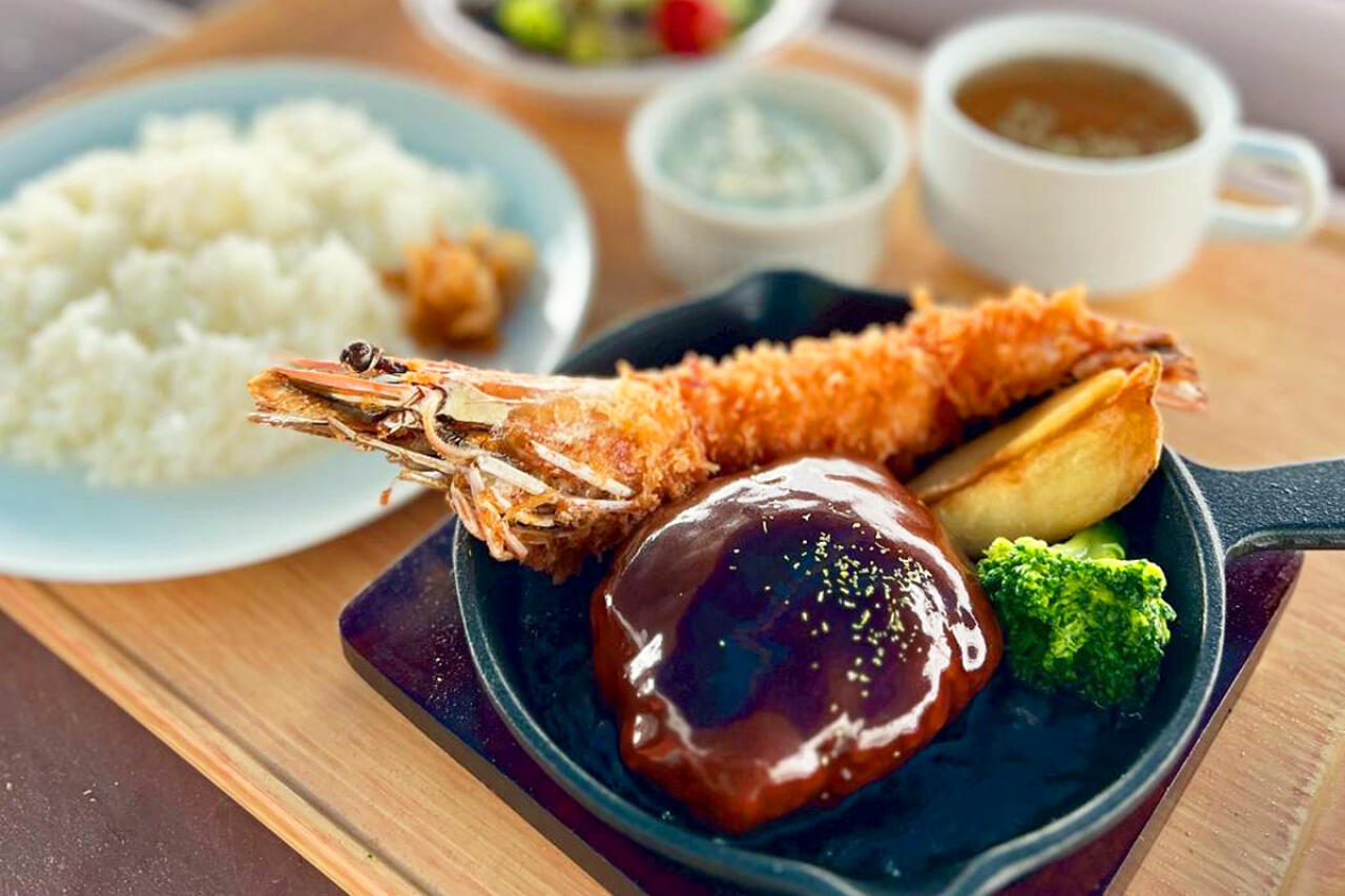 「道の駅志原海岸」の2階に、手作りの洋食がそろう食堂がオープンした。イチオシは、デミグラスソースが自慢の国産牛ハンバーグとプリプリ食感のエビフライが並ぶ欲張りなセット。鉄板での提供で、熱々のまま堪能できる。セットメニューは全てご飯とスープ、サラダが付く。注文は券売機の利用を。テラス席はペット同伴OK。