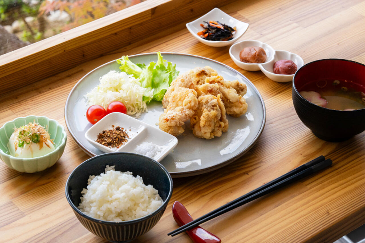 梅干し屋が営むくまへいカフェでは、「梅酢唐揚げ定食」に自社製の梅スパイスが付くのが魅力。オリジナルの梅酢でさっぱり仕上げた唐揚げに日替わり小鉢、みそ汁付き。9種類の梅干しの食べ比べも堪能できる。地元商店のしらすを使った丼もオススメ。Wi-Fi完備で、カフェ利用はもちろんPC作業にも◎。20台以上停められる広い駐車場を備え、車も停めやすい。