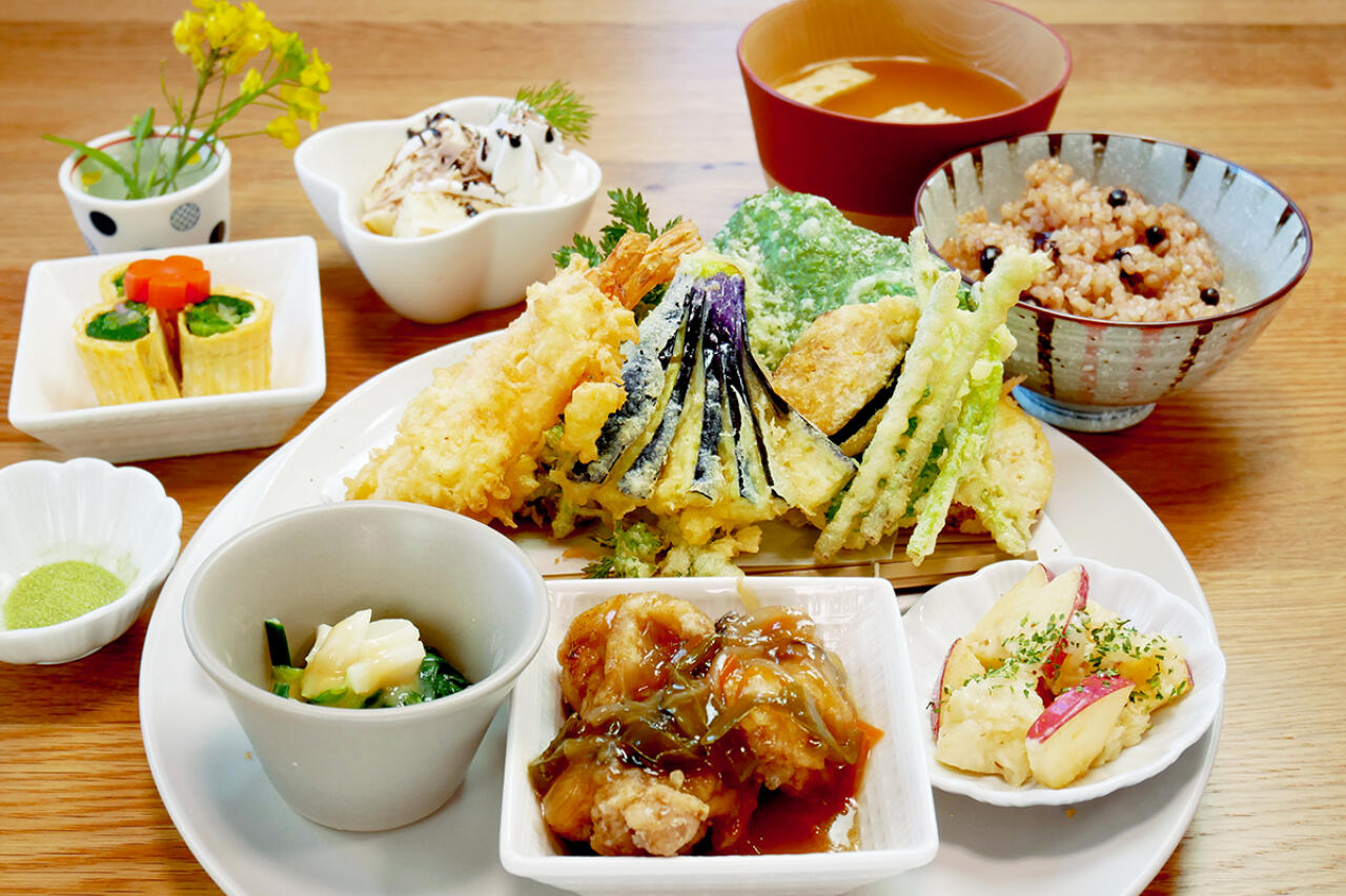 家庭的な味を楽しめる明かり家に、新メニュー「季節のおばんざい」が仲間入り。旬菜やエビなど6種類の天ぷらを中心に、季節の小鉢が3~4品並ぶ。ご飯は発酵玄米や炊き込みご飯など、半月ごとに内容を替えて提供。訪れるたびに季節の味に出合える。店内には個室もあり、小さな子ども連れも歓迎。