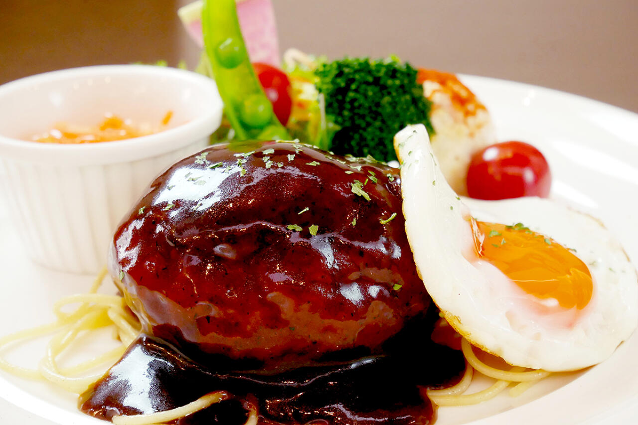 ランチで評判の「特製ハンバーグステーキ」は、ふっくら大きなハンバーグにデミグラスソースがたっぷり!口に運べば、ジューシーな肉汁とたっぷりのうま味を堪能できる。スープ、サラダ、ライスも付いて満足感も十分。火曜は「ハンバーグの日」として、いつもよりちょっとお得に利用できる。15食限定で売り切れ次第終了。